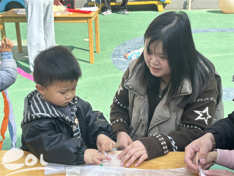最受宝贝们期待的手工创作环节如约登场。幼儿园提前准备了塑料袋、彩纸、麻绳等丰富的创作材料,宝贝们与家长默契分工、通力合作,一场创意大比拼就此展开。有的认真为塑料袋涂上缤纷色彩,有的精心用彩纸剪出灵动的风筝尾巴,还有的小心翼翼地用麻绳系好风筝骨架,在亲子携手创作中,一只只造型独特、充满童趣的春日风筝新鲜出炉,每一件作品都藏着宝贝们天马行空的想象。