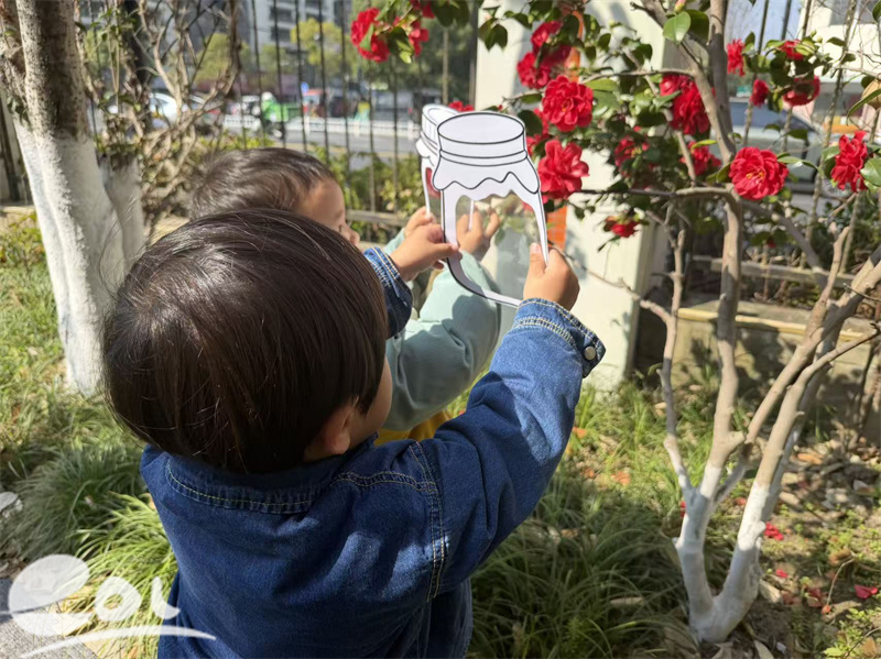律动结束后,一场趣味十足的春日探索之旅正式开启。宝贝们手持透明塑封瓶,带着精致的蝴蝶装饰,化身小小自然探索家。他们蹲下身来,细细观察校园里的一草一木,寻找嫩绿的新芽、娇艳的小花、飘落的枝叶,小心翼翼地将这些春日美好装进瓶中。在看一看、摸一摸、闻一闻的沉浸式体验中,宝贝们直观感受着春天的独特气息,在自然探索中收获了发现的惊喜与快乐。