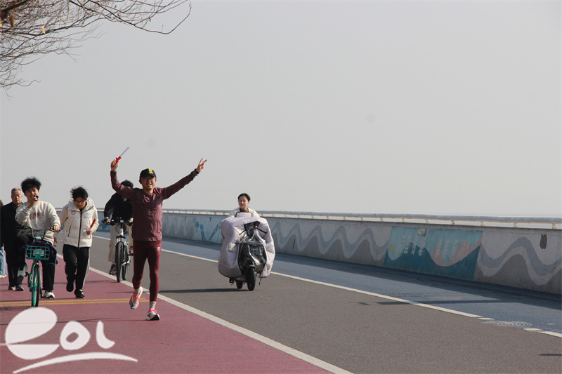 发令声响,各队第一棒选手率先冲出起点线,迎着春风踏上沿江跑道。