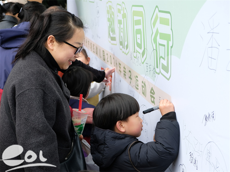 走近签名墙,孩子们牵着家长的手,留下属于自己的专属印记,一旁灵动可爱的机器狗活力助阵、趣味互动,瞬间点燃现场欢乐氛围。