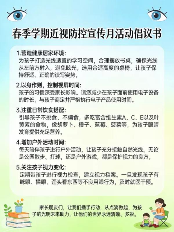 幼儿园也发出护眼倡议,号召家长陪伴孩子开展户外亲子活动,将近视防控融入家庭日常,让户外活动成为孩子的“护眼良方”,携手培养孩子良好的用眼和生活习惯。