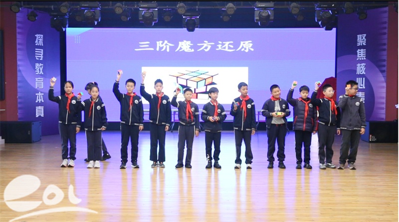 活力四射的暖场舞点燃了现场的热情,五年级两位主持人从容大方,流畅地串联起活动的每一个精彩瞬间。同学们娴熟演绎的三国华容道、激烈紧张的魔方展演,牢牢吸引了在场所有人的目光。现场不时响起阵阵赞叹声与热烈的掌声,热闹非凡。
