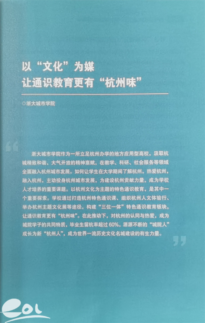 围绕杭州建设世界一流历史文化名城的目标,学校积极探索特色通识教育新路径,依托多部门协同发力,构建起特色“杭州课”、人文“杭州行”、主题“杭州展”三位一体的杭州文化特色通识教育体系,让通识教育扎根本土、贴近城市、浸润人心,走出了一条校地共生、文旅共育、知行合一的育人新路。