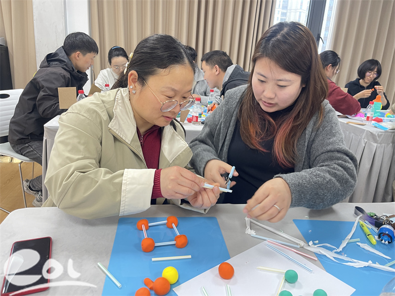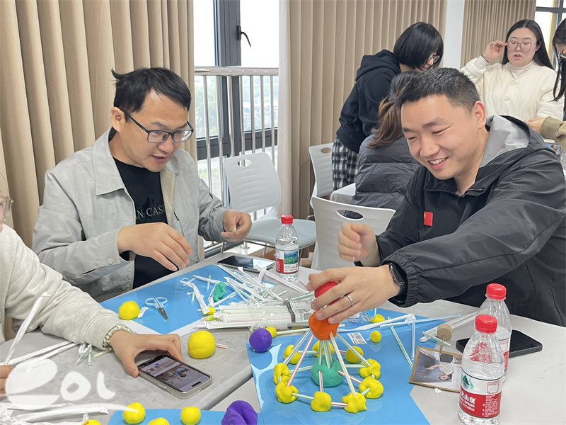 创意满满的“共建天空之城”手工环节将活动推向高潮。家长们4人为一组,使用吸管、黏土动手搭建创意作品,过程中相互交流思路、协作配合,复刻了幼儿日常游戏中的探索与合作。完成后的作品依次展示,家长们分享创作理念,优秀作品将在幼儿园陈列,成为家园共育的美好见证。