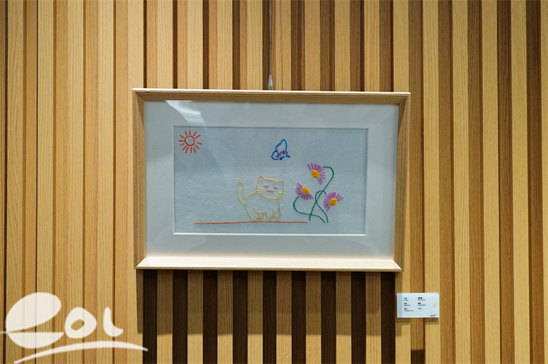 “她画得不太好,但刺绣,她比较擅长。”展厅一角,一幅以小猫为主题的刺绣作品吸引了不少人的目光。这幅作品,第一眼看上去的感觉就是清爽,米黄色的小猫惬意地晒着太阳,与一只蝴蝶玩耍,灵动而治愈。