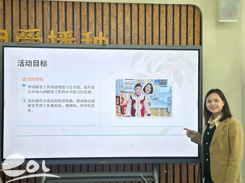 后勤分管副园长李老师以图文并茂的形式,系统展示幼儿园膳食工作亮点,从食材溯源到烹饪细节逐一细致介绍。李老师细致解读不同年龄段幼儿的餐食配置方案,将春令食材与时令温补巧妙融合。
