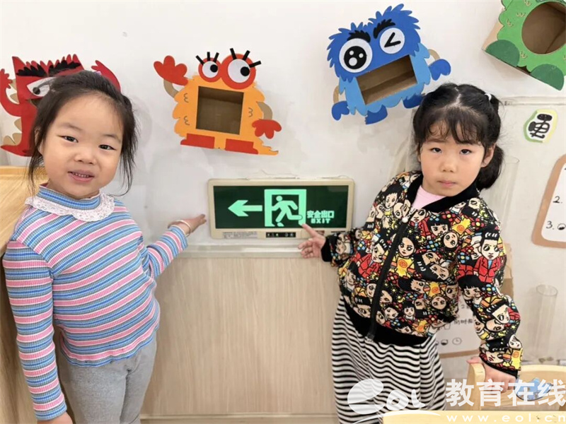 在安全周里,孩子们还化身“小小安全员”在园区内,逐一排查“安全出口”“应急灯”等常见安全标识是否完好,寻找幼儿园存在的安全隐患并绘制了自我保护小贴士,比如:不靠近窗户以免撞头、上下楼梯不奔跑等。