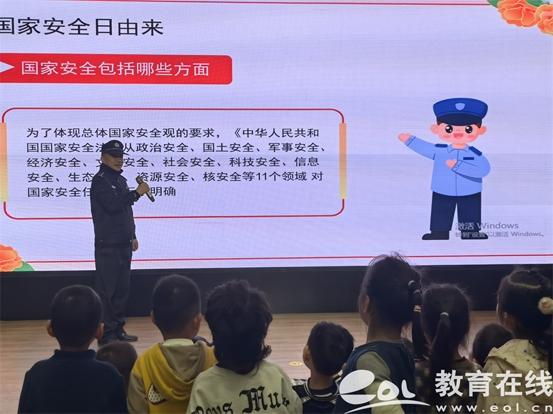 民警叔叔结合幼儿年龄特点,用生动形象的语言和直观的课件,向孩子们讲解了总体国家安全观的基本内涵,从贴近生活的角度讲解政治安全、国土安全、网络安全,告诉孩子们国家安全与每个人息息相关,了解维护国家安全的重要性。