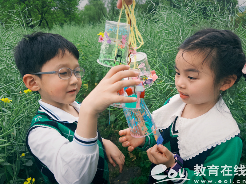 中班的孩子们则化身为春天的“花草信使”,开启了一场与花草对话的探秘之旅。他们手提小竹篮,在草地和林荫间细心寻觅,轻轻捡起飘落的花瓣,巧手制作出一件件精美的花草作品,将大自然慷慨地回赠“带”回家中。这场“花草信使”之旅,让孩子们在拾捡与创作中,读懂了春天的温柔与慷慨。