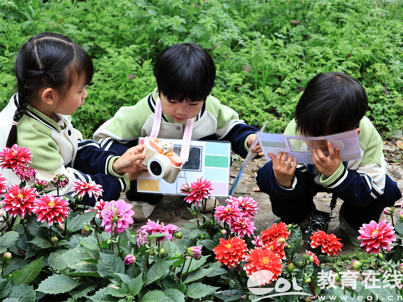小班的萌娃们手持镂空色彩卡片,穿梭于花丛草叶之间,像一群好奇的小探险家,蹒跚地穿梭于花丛与草叶之间。他们用稚嫩的双眼搜寻春天的每一抹色彩,将烂漫春光“装”进小小的画框里。让孩子们在用眼睛“捕捉”色彩的过程中,感受到了大自然的神奇与美好。