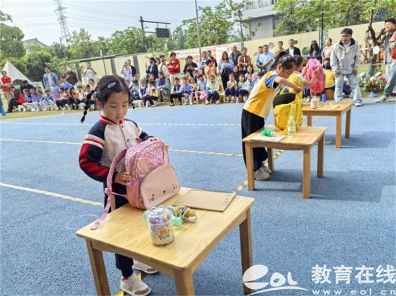 为了让幼儿提前体验小学生整理书包的过程,设计趣味接力赛“整装待发”。比赛过程中,小队员们有条不紊地将书本、水壶等物品快速装入书包,拉好拉链后迅速折返,团队协作的精神在每一个动作中展现得淋漓尽致。