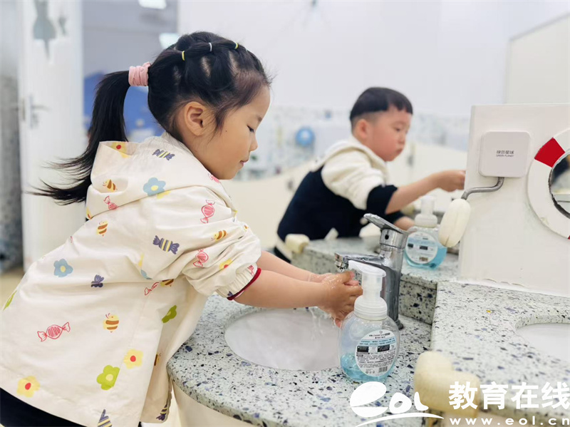 各班围绕生活常识、行为习惯等,开展卫生健康教育活动,提高孩子们讲卫生意识,增强自我防护的能力。孩子们从身边的小事做起,在提高动手能力的同时也进一步强化了他们爱清洁、讲卫生、爱劳动的意识。“两个好朋友,手碰手,你背背我,我背背你。”托班孩子们一边念儿歌一边清洗小手,预防病从口入,爱国卫生从洗手做起。