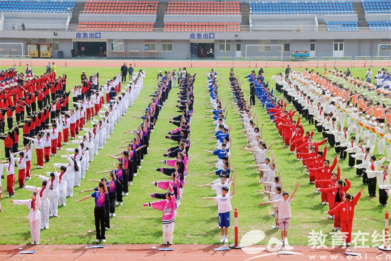 随后的入场式,每个班级都亮出自己的运动特色。一年级玩飞盘、踩滑板,二年级跳房子、打冰壶,三年级转呼啦圈、踢毽子,四年级练武术、挥网球拍,五年级打排球、颠空竹,六年级舞花球、举红旗。项目不同,热情相同;年龄有别,活力无差。孩子们用自己喜欢的方式,诠释对运动的理解。
