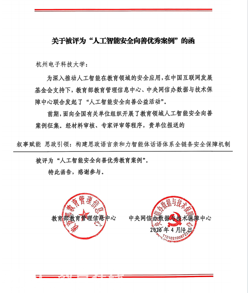 近日,在教育部教育管理信息中心与中央网信办数据与技术保障中心联合发起的“人工智能安全向善公益活动”中,杭电报送的《叙事赋能 思政引领:构建思政语言亲和力智能体话语体系全链条安全保障机制》案例,经严格评审成功入选“人工智能安全向善优秀教育案例”,成为展示我国人工智能安全向善实践的重要标杆之一。