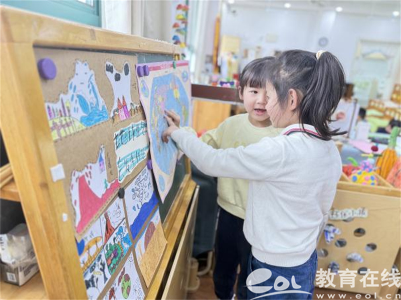 在热闹的地球分享会上,孩子们围在世界地图旁,你一言我一语地分享着自己对地球的认识。他们用小手指着地图上的陆地和海洋,兴奋地讲述着地球上的山川河流、花草动物。在自由的团讨与分享中,大家对这颗孕育生命的蓝色星球,有了更真切的感知与热爱。