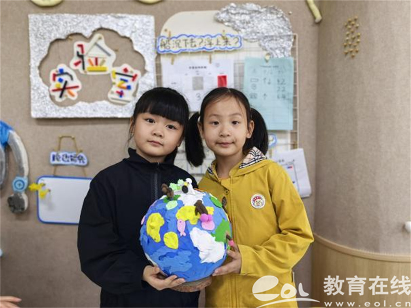 最让孩子们兴奋的,莫过于立体地球创作环节。大家把泡沫球、废旧皮球变成了创作载体,用小手尽情打造自己心中最美的地球。有的用蓝绿色粘土捏出起伏的陆地与海洋,再用彩笔添上大树、小鸟和游来游去的小鱼;有的捏出尖尖的珠穆朗玛峰、冒着“咕噜咕噜”冒出岩浆的小火山,还有可爱的仙人掌。一个个鲜活生动的地球在孩子们手中诞生,每一个都藏着他们对美好家园的独特想象。