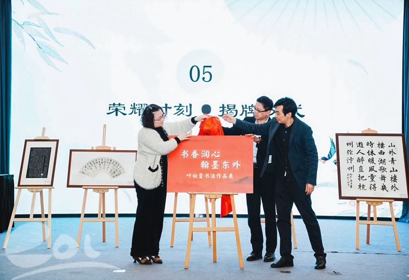最动人的环节当数“书法 + 舞蹈”沉浸式融合表演。701黄宣凯、703叶祉萱、704许清婉三位同学在油纸伞上现场挥毫泼墨,701周轩宇、袁钰彤、702沈欣怡同学伴以古典舞蹈,墨香与舞姿交融,尽显中华传统美学意境。特邀书法专家与陈华锋老师现场品鉴作品,以经典范例讲解书法艺术与审美提升,寄语同学们浸润笔墨、涵养心性、提升素养。随后,特邀书法专家、陈华锋老师、陈立剑校长、叶祉萱妈妈共同上台揭牌,宣告书法作品展正式开展,定格校园美育高光时刻。