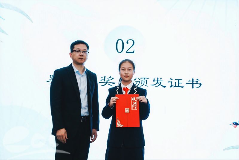 陈立剑校长为叶祉萱同学颁发作品永久收藏证书,肯定她的艺术追求与不懈努力,寓意优秀笔墨作品永久珍藏于校园,成为东外美育文化的珍贵印记。