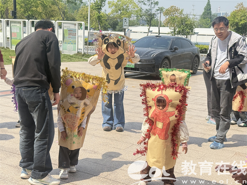 随后,亲子携手开启牛皮纸袋动物服饰DIY之旅,宝贝们用海绵印章印画、彩纸粘贴,家长辅助剪裁固定,大手牵小手共同将普通纸袋变身青蛙、熊猫、长颈鹿等萌趣造型。