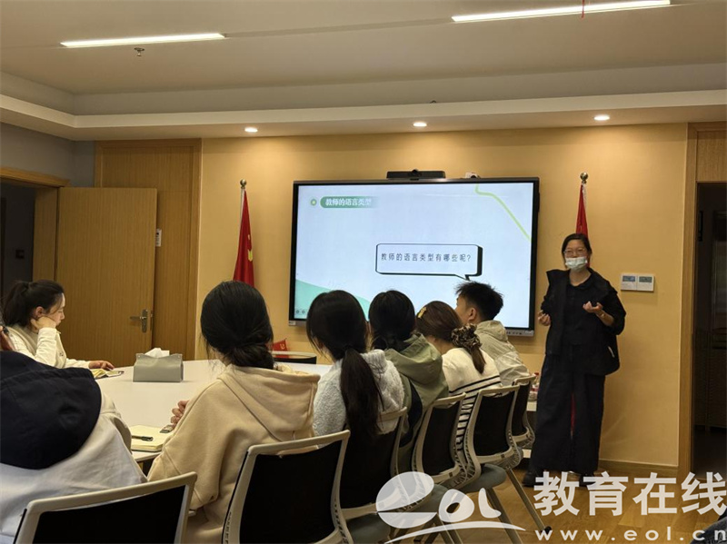 紧接着,周老师发起游戏互动,引导老师们思考常见的教师语言结构类型。随后,带领全体教师系统梳理了幼儿园教学场景中常见的语言类型。从提问方式来看,既有指向事实确认的封闭式提问,也有支持幼儿自由表达的开放式提问,更有引导幼儿思考解决方法的启发式提问、探寻深层原因的追问;从评价语言来看,对比了泛化表扬与指向具体行为的评价、肯定与建议结合的引导性评价的不同效果;从课堂小结来看,区分了无回顾、简单复述与经验提升式小结对幼儿经验建构的不同作用;从指令语言来看,也明确了清晰具体的指令,远比模糊笼统的表述更易被幼儿理解与执行。