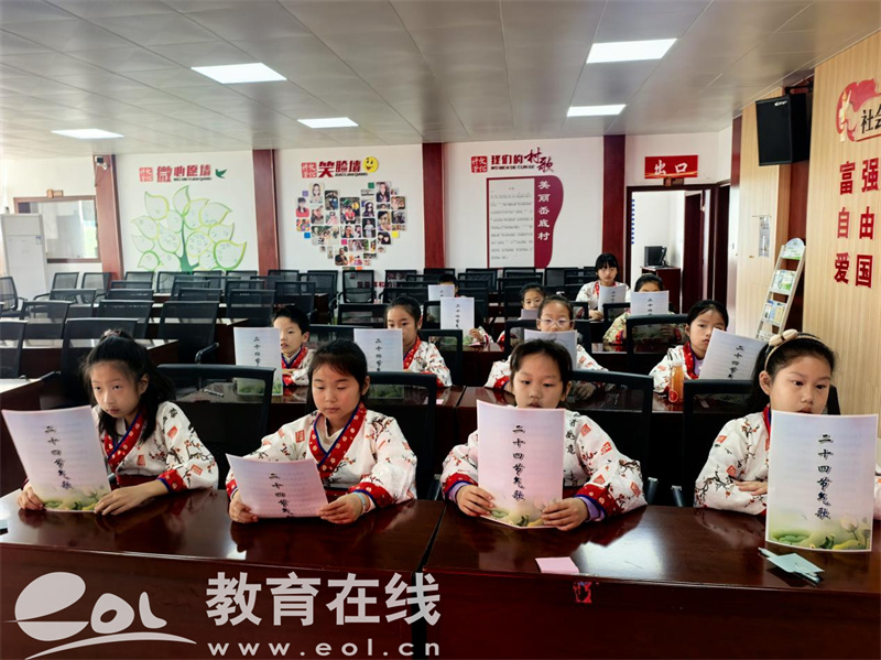 第一环节:节气诵读・花卉DIY。文化广场上,学生们齐诵《二十四节气歌・春分》,在古风乐声中感受先民顺天应时的农耕智慧。随后的花卉手作环节,孩子们亲手制作春分主题作品,既用于后续“敬土献祭”,也成为可带回家的文化记忆。