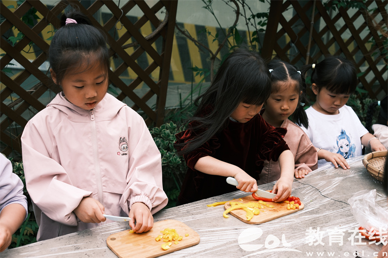 “我来帮你!”“看,我剥出了一颗好大的豆!”孩子们围坐在一起,小手灵巧地剥开豆荚,一颗颗饱满的豆宝宝滚落下来。孩子们小心翼翼地拿起安全小刀,将彩椒切成小丁。红的、黄的、绿的……五彩斑斓的食材整齐地摆在盘子里,等待着变身成为美味的立夏饭。