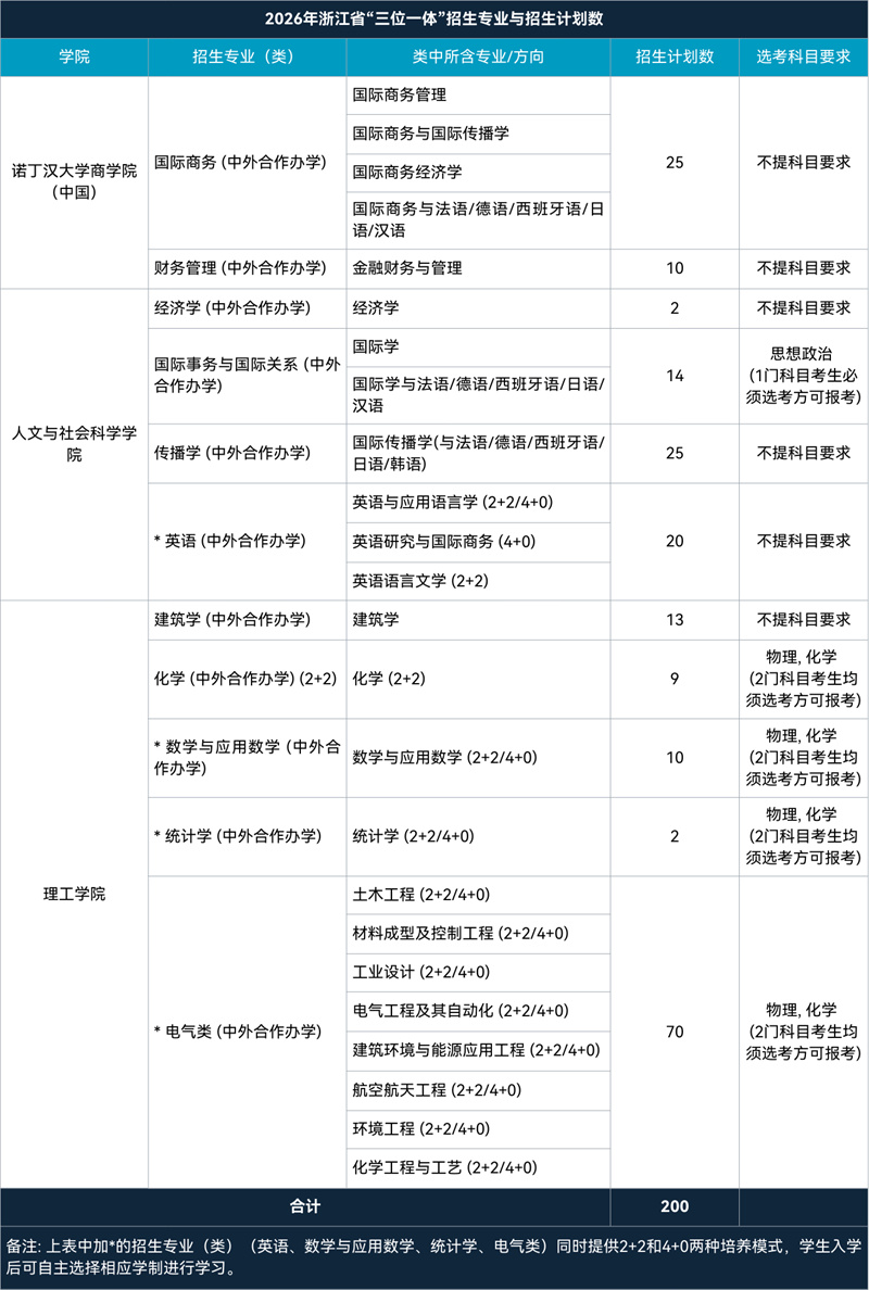 2026年浙江省“三位一体”综合评价招生计划数为200名。具体招生专业(类)名称、计划数及选考科目要求如下表:
