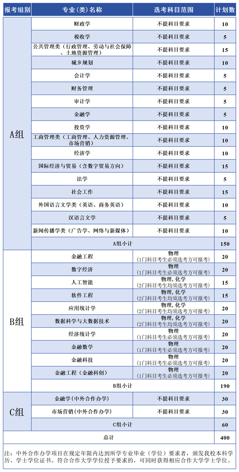 第十二条 学校“三位一体”综合评价招生面向浙江省招生,总计划数为400名。学校将招生专业(类)分为A组、B组、C组三个组别,考生只能选报其中一个组别,不能兼报,具体专业招生计划如下表: