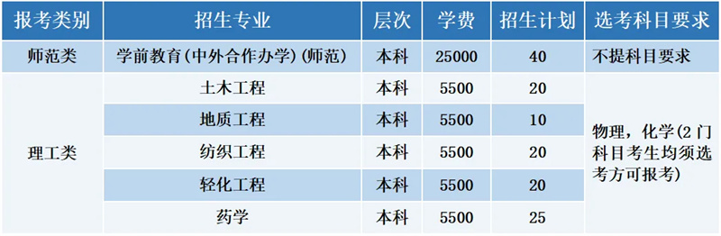 2.对考生身体健康要求,学校执行教育部《普通高等学校招生体检工作指导意见》的规定。特别提醒:为不影响毕业就业,建议体检色觉异常(色盲、色弱)者谨慎报考学前教育(中外合作办学)(师范)、轻化工程、药学等专业。