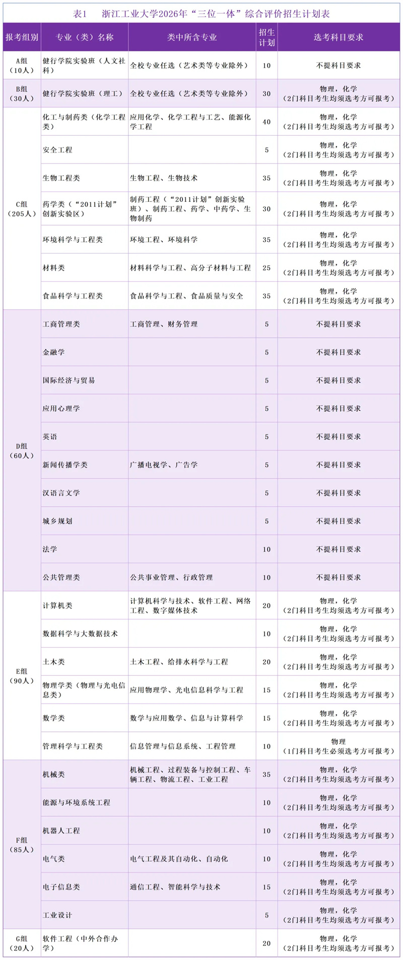 学校“三位一体”综合评价招生面向浙江省招生,总计划数为500名。学校将招生专业分为A组、B组、C组、D组、E组、F组和G组7个类别。考生只能选报其中一个专业组,不能兼报。具体报考专业组类别、专业类名称、包含专业、计划数及报考相关专业所需的选考科目要求见表1。