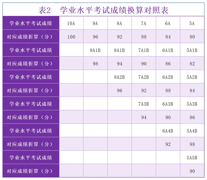 第二十一条 对进档考生,按综合成绩从高分到低分进行排序。综合成绩按“学业水平考试成绩(折算成满分100分)×20%+综合素质测试成绩(折算成满分100分)×20%+高考总分(折算成满分100分)×60%”计算形成(各项成绩均保留三位小数)。若考生综合成绩相同时,则按单项顺序及分数高低排序,单项顺序排列依次为:综合素质测试成绩、高考总分(同分则按照高考位次号排序)、学业水平考试成绩。其中,学业水平考试成绩换算见附表,高中阶段具备相关选修课程学分或相关选修课程成绩优良的,在同等条件下优先录取。新高考改革前的往届生技术科目学业水平考试等第按考生的信息技术、通用技术科目中等第高的计入。
