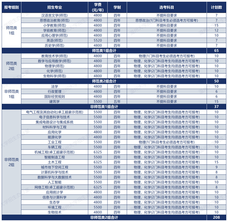 2026年温州大学“三位一体”综合评价招生总计划数为360名,分四种报考组别,其中师范类1组65名,师范类2组50名;非师范类1组37名,非师范类2组208名。具体如下: