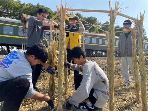 “我们需要先用木条打造框架,再按步骤铺设稻草。”正忙着制作“稻草收割机”的大二学生李铖介绍,为了把稻草变废为宝,他们已提前做过多套设计方案,与小组同学共同讨论了支架定位方法和艺术装置的尺寸,“我们还准备了颜料、鲜花等辅助装饰,以期装置能呈现可爱有趣的效果。”