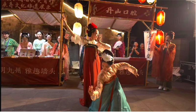 在墙头历史文化街区的中医药文化广场上,“星耀四明·海韵潮音”转角遇艺文艺展演中,文化特派员携手宁波文艺志愿团队的师生们,以匠心独运的艺术构思巧妙融合汉、唐、宋、明等历代雅事与中华传统医药文化,精心创作《九州同游雅事录》等富有时代气息的新颖作品;同时推出“溪里有方·大美健康”系列文创产品《五彩福禄》,将传统美学与现代设计完美结合。宁波市曲艺家协会陈一卿老师即兴创作《九州巷弄里的卖货郎》,以生动的艺术语言再现市井生活的烟火气息,让古老的非遗在皎洁月光下熠熠生辉。
