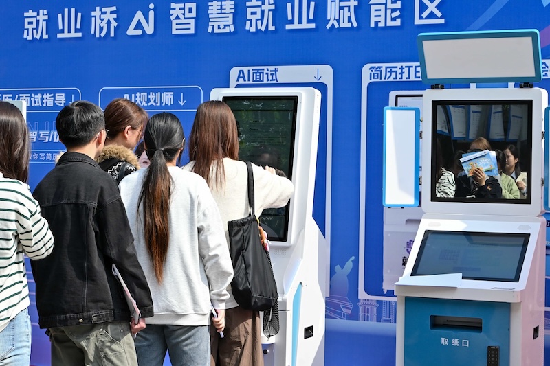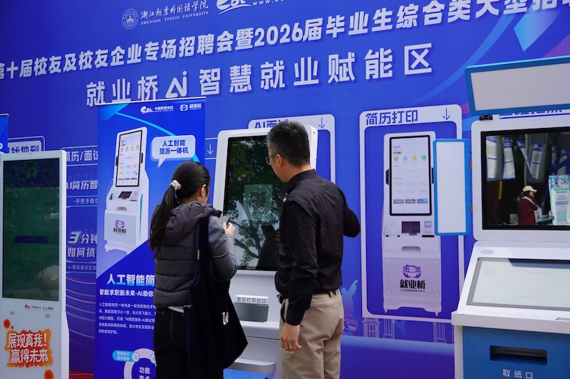 尤为引人注目的是“AI智慧就业赋能区”,学校首次将人工智能深度整合进求职全流程,为学生提供覆盖“就业查询-生涯探索-简历优化-模拟面试”的一站式人工智能就业服务专区,现场同学积极体验就业服务一体机、生涯探索一体机、简历打印一体机和人工智能模拟面试屏,深受广大师生喜爱。通过AI赋能,在提升了毕业生求职竞争力的同时,更精准、更高效地促进人岗匹配。