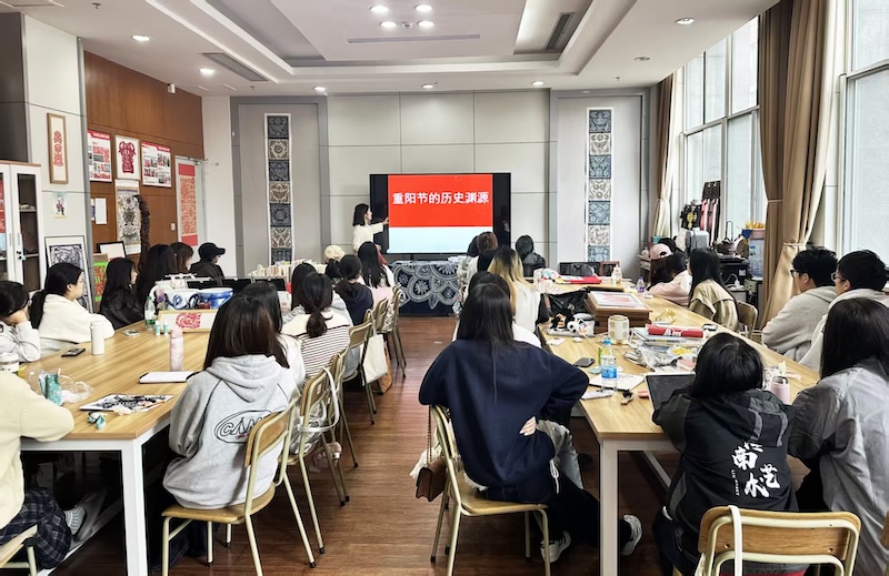 “古人重阳佩茱萸,不只是习俗,更是‘遥知兄弟登高处’的牵挂。”课堂伊始,张霞儿老师从重阳节的渊源讲起:她指着投影里的古籍插图,细说茱萸“辟邪祈福”的寓意,又以王维的诗句为引,拆解“吴茱萸”背后的思乡敬老典故。“你们是设计师,更是文化的传承人。”
