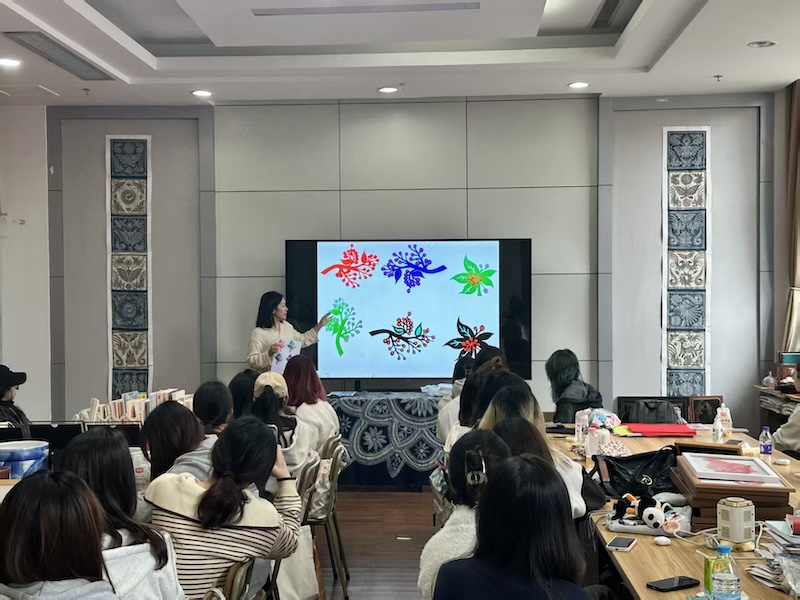 随着张老师的剪刀在宣纸上翻飞,一片没有底稿的茱萸叶渐渐成型:“脱稿剪纸靠的是手感,更是对纹样的理解。”她从自由造型的构思,讲到线条粗细的把控,再到剪刀力度的轻重,手把手带着学生入门。很快,工作室里响起此起彼伏的“咔嚓”声:学生们将宣纸折叠、对齐,有的剪出形态各异的茱萸枝,有的创作象征高洁的菊花,还有人尝试彩色剪纸技法,让红色的花瓣、绿色的叶片在纸上“绽放”。“我要把这朵菊花剪得精致些,以后送给奶奶当书签。”学生吴思苗的话,道出了不少人的心意。