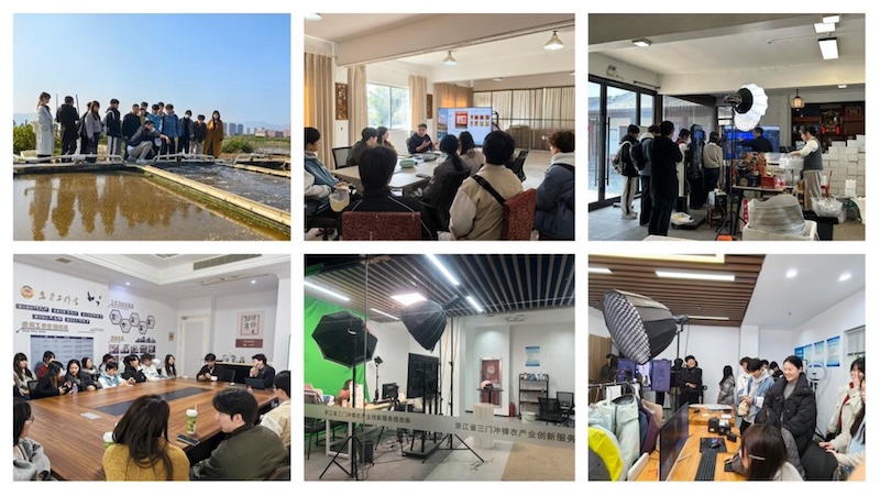 为强化学生实战能力,11月22日,商学院组织参赛学生赴三门开展赛前实训。同学们走进涛头村“鲜礼家”水产直播基地,实地了解青蟹、血蛤等小海鲜的产品特性,观摩真实直播流程,特邀台州市鲜礼家生态农业有限公司负责人杨丰恺现场授课传授直播技巧;在浙江省三门冲锋衣产业创新服务综合体,同学们学习直播场景搭建与镜头表达,三门技师学院数字商贸分院院长周彬彬系统讲解直播话术与运营逻辑;此外,学生还走访森波户外用品股份有限公司,深入了解产品工艺与品牌故事。一系列沉浸式实训,使学生从“纸上谈兵”迈向“战场演练”,真正实现了“学中做、做中创”。