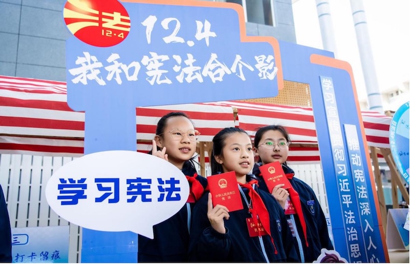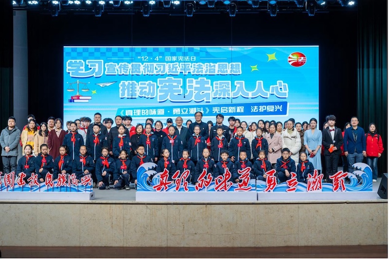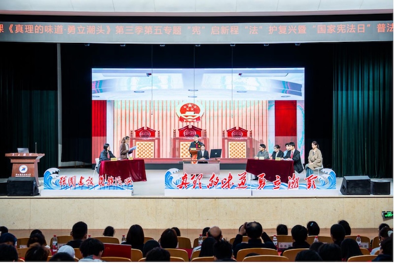 这是该校特色思政课《真理的味道・勇立潮头》第三季第五专题暨“国家宪法日”系列普法宣传教育活动的开端。围绕“学习宣传贯彻习近平法治思想,推动宪法深入人心”的主题,学校以“‘宪’启新程‘法’护复兴”为主线,精心设计了“诵读宪法”“深悟法理”“以案释法”“育法于行”四个特色教学环节,通过一场沉浸式的“法治之旅”,让抽象的法治理论变得可知可感。