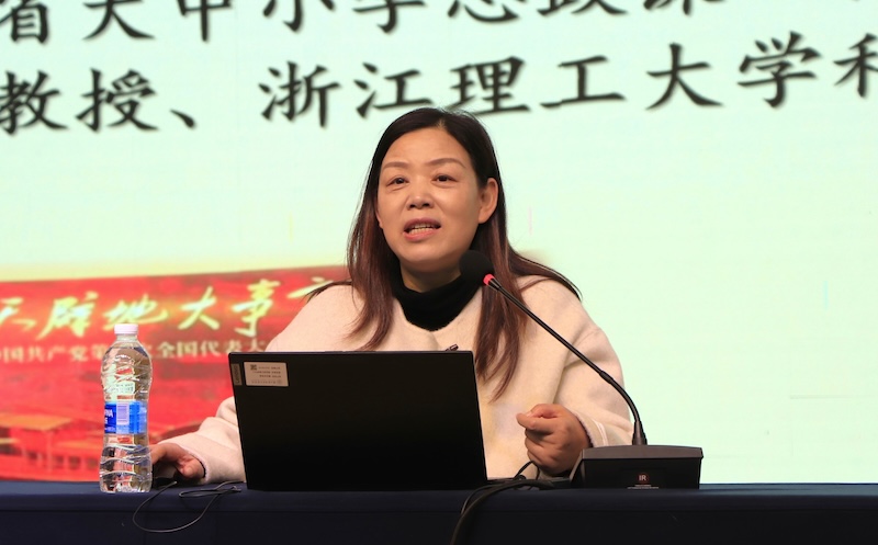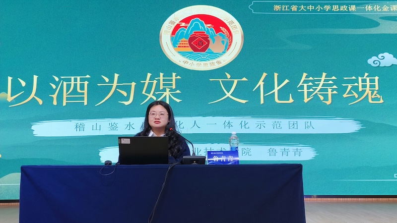 下午“同课异构”辅导与研讨阶段由浙江越秀外国语学院马克思主义学院副院长史丽琴主持。鲁青青老师作题为“以酒为媒 文化铸魂——浙江省大中小学思政课一体化示范‘金课’的探索与实践”的报告。她系统阐释了对大中小学思政课一体化建设的深刻理解,并结合自身备赛的实践经验,生动讲述了这场示范金课打造背后的“绍兴回应”,现场展示了一堂贯穿小学、初中、中职、高中、高职、大学六个学段的思政一体化示范课,为思政课一体化落地提供了鲜活的地方样本。