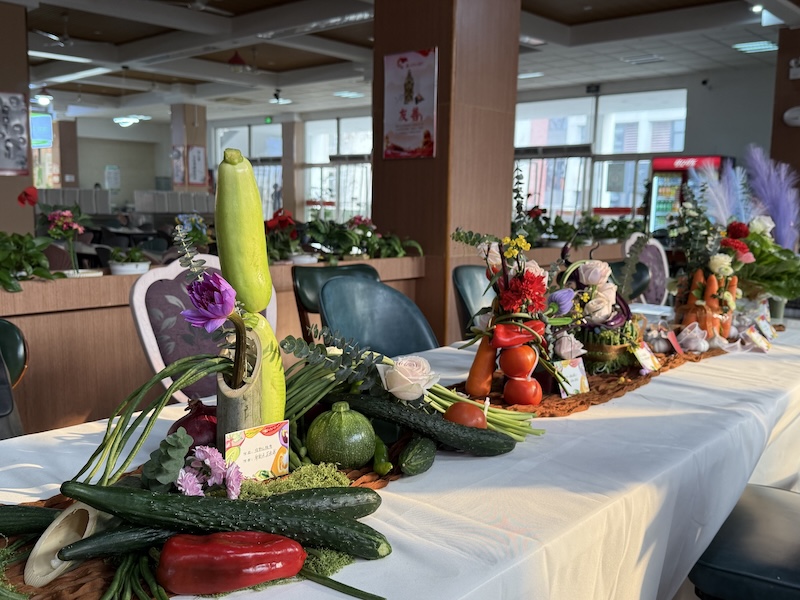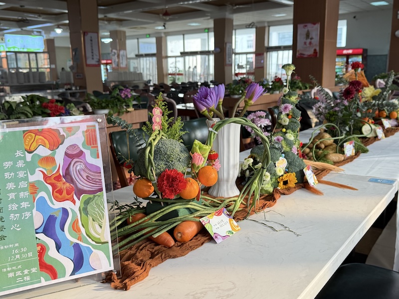 长桌中央的创意布置,成为全场焦点,不少师生纷纷驻足掏出手机拍照打卡。西兰花扎成精致“花簇”,长豆角缠绕成灵动“藤蔓”,胡萝卜、洋葱搭配小雏菊点缀其间,就连南瓜也贴上了俏皮的笑脸贴纸。这些独具匠心的“食材花艺”,均出自该校艺术设计学院学生之手,创作原料一半源自学校劳动实践教育基地“勤园”的自产蔬菜。