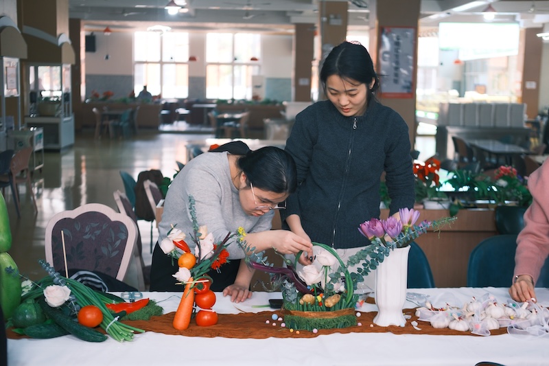 “原本计划用鲜花布置,后来觉得用自己亲手种植的蔬菜更有意义,也更贴合劳动美育的主题。”参与布置的学生董晓婷介绍,仅为西兰花打造美观造型,她们就反复尝试了三种捆扎方式,在不断调整中打磨细节、感受创作乐趣。