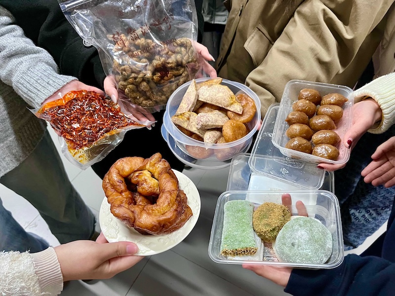 正说着,毛心怡咬下一口同学陈佳艳带来的油堆,眼睛瞬间亮了。陈佳艳带来的,是妈妈亲手做的油堆和炸芋头。陈妈妈是广西人,今年有事没能回老家过年,便在家里做起了家乡小吃。“我妈听说我要带回学校,特意现做的!”陈佳艳一边说,一边打开食盒。油堆软糯,芋头酥香,盖子一掀,室友们的手就伸了过来,你一块我一块,瞬间盒子里少了大半。