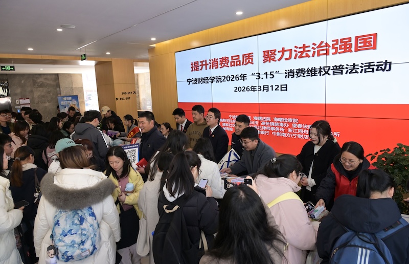 (通讯员:徐凯阳 黄汝杰 摄影:孔子健)“直播间买到假货该怎么维权?”“预付卡商家跑路如何追回损失?”3月12日,宁波财经学院校园内热闹非凡,一场主题为“提升消费品质・聚力法治强国”的2026年“3・15”消费维权普法活动火热开展。学校携手海曙区人民法院、人民检察院等14家单位,通过趣味答题、现场咨询、案例讲解等多样形式,为全校师生奉上了一份干货十足的法治维权“大礼包”。