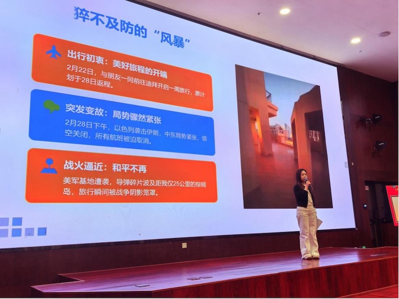随后,时空转至当下。该院学生葛家乐分享了月初因突发地缘冲突滞留迪拜,最终登上国家撤侨航班顺利归国的经历。“窗外车水马龙,耳边是导弹拦截闷响,让我深知和平从非理所当然。”从最初的恐慌无助到3月5日搭乘撤侨首班航班踏上祖国土地的安心,她动情地说道:“那一刻,眼泪一下子就下来了,我真正读懂了‘祖国带我回家’的含义。”如今重归校园方知稀松日常的珍贵,这份平静背后是先辈的守护和国家的强大实力。