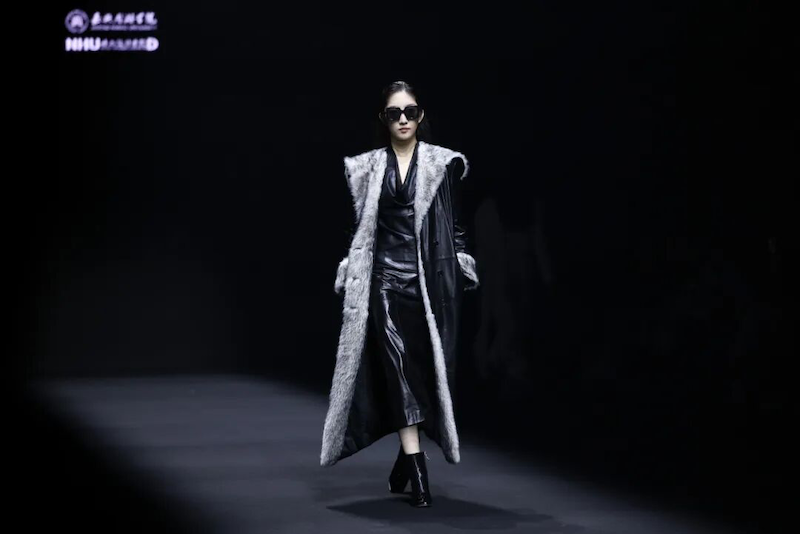 40套作品的背后,是师生团队历时六个多月的精耕细作。嘉兴南湖学院时尚设计学院先后组织相关人员12次奔赴海宁面料市场,从200余种面料中精选契合设计理念的材质;师生团队与产业教授协同,历经数十轮打样、试衣与修改,对每一处皮革的利落廓形、皮草的流动肌理、织锦的数字解构纹章反复推敲,将传统工艺与现代审美在一次次打磨中深度契合。