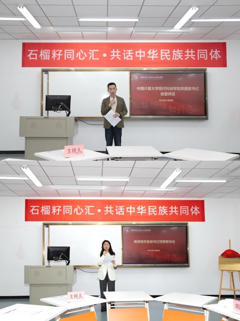 (通讯员:王涛)为深入学习贯彻习近平总书记关于加强和改进民族工作的重要思想,全面落实立德树人根本任务,扎实推进铸牢中华民族共同体意识教育,4月8日,中国计量大学现代科技学院在一站式学生社区举行“石榴籽 同心汇”民族团结进步主题活动。全国民族团结进步模范个人、义乌市民族团结进步促进会副会长兼秘书长张莉受邀莅临,与全校师生共话民族团结、共绘育人蓝图。义乌市教育局党委委员、副局长吴彩军、佛堂镇党委副书记范黎黎、现代科技学院党委副书记徐鎏及马克思主义学院全体教师及佛堂区域大中小学思政教育一体化联盟中小学教师及四十余位少数民族学生代表参加活动。