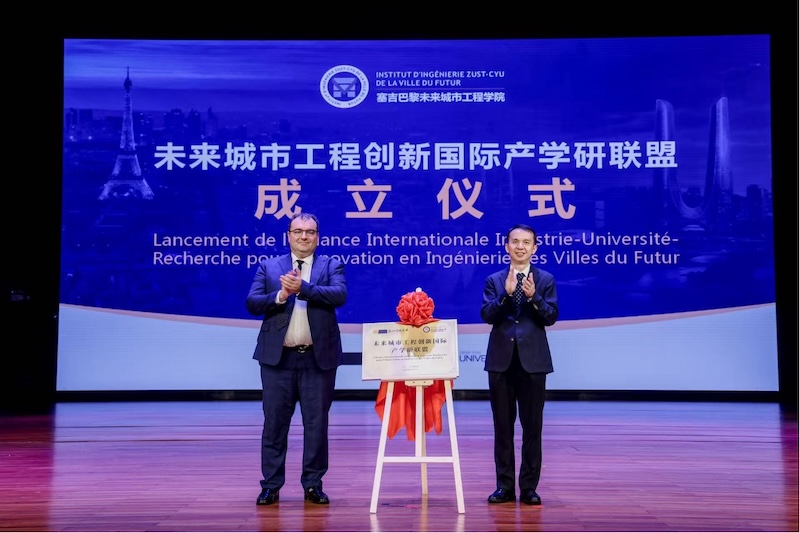 活动现场,陈建孟、洛朗·加蒂诺为两校发起的未来城市工程创新国际产学研联盟揭牌。该联盟汇聚中法高校、科研机构与龙头企业的创新力量,为未来城市建设注入全新动能。