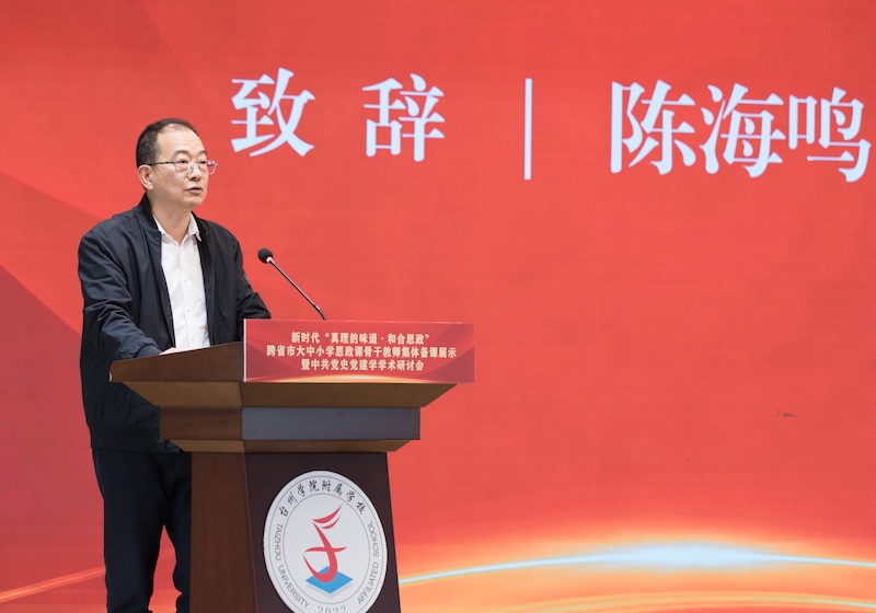 陈海鸣指出,本次研讨会恰逢习近平总书记“3・18”重要讲话发表七周年,是落实立德树人、强化中共党史党建学学理支撑、推动省内外大中小学思政协同创新的重要举措。他表示,台州坚持把思政教育摆在核心位置,打造“真理的味道・和合思政”品牌,构建贯通协同的育人体系,在一体化研究中心建设、本土课程开发、师资队伍培育、跨省思政联盟共建等方面取得明显成效。他强调,要坚守铸魂育人方向、深化跨学段跨区域协同创新、强化师资与责任落实,不断提升思政一体化建设水平。台州将以此次研讨会为契机,借鉴先进经验,持续擦亮思政品牌,打造特色育人模式,为培养时代新人贡献力量。