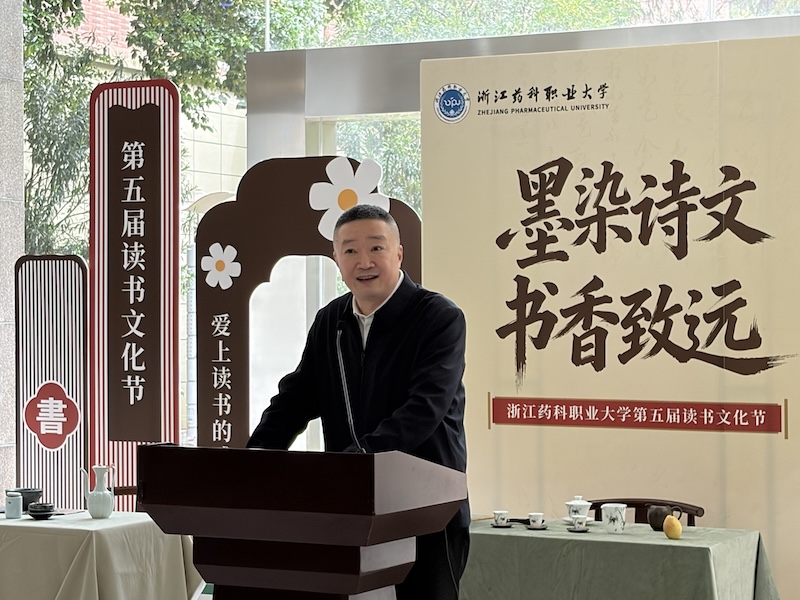 开幕式上,副校长姜宇国致辞并宣布浙江药科职业大学第五届读书文化节开幕。他充分肯定了举办读书文化节的重要意义,在《全民阅读促进条例》正式施行的时代背景下,学校始终秉持“以文化人、以文育人”的教育理念,以书香涵养药德、以文化浸润匠心,不断丰富书香校园的深厚内涵。图书馆连续多年举办读书文化节,以“药典拾遗”阅读推广品牌为引领,组织精品书展、阅读分享、专家讲座、书画体验、经典诵读、主题征文等系列活动,宣传推广中华传统文化,致力于打造集药香、书香、墨香为一体的校园文化。他深刻指出,在这个技术革新的时代,阅读是获取定力的重要途径,深度阅读能够赋予我们提出问题的能力、辨别价值的眼光、涵养心境的智慧,并提出三点希望:一是坚守深度阅读,筑牢思想根基,沉心静气品读经典著作、人文典籍,筑牢立身行事的思想根基;二是融合数智工具,精进专业学识,精准获取专业前沿资讯、学术研究成果,扛起肩负的责任与使命;三是践行终身阅读,拥抱创新未来,在持续阅读中拓宽视野、活跃思维,应对时代机遇与挑战。